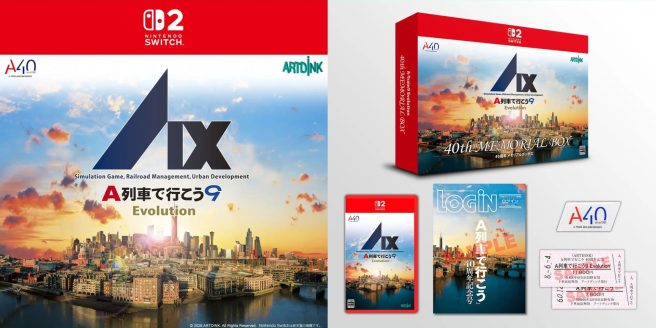 The title is also to receive a special 40th anniversary memorial box. The special edition will include a LOGiN & Weekly Famitsu A-Train 40th Anniversary Edition magazine (B5 size, 56 pages), an A-Train 40th anniversary pin badge, a set of 2 commemorative train tickets themed around the A-Train franchise, and the game- key card version of A-Train 9 Evolution. A western release is still yet to be announced