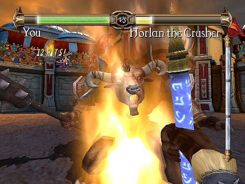Rage of the Gladiator is a fantasy fighting game. You control a gladiator, fighting for your life in an arena. Armed with your magical warhammer and a trusty shield, you must defeat fantastic bosses including a Chimera, Beholder, and a Dragon. The game is set in first-person perspective.