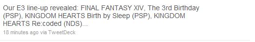 According to Square Enix, a new Kingdom Hearts game is on its way to the DS. Oddly enough, the news comes from a low-key E3 lineup detail on the company’s official European Twitter account.