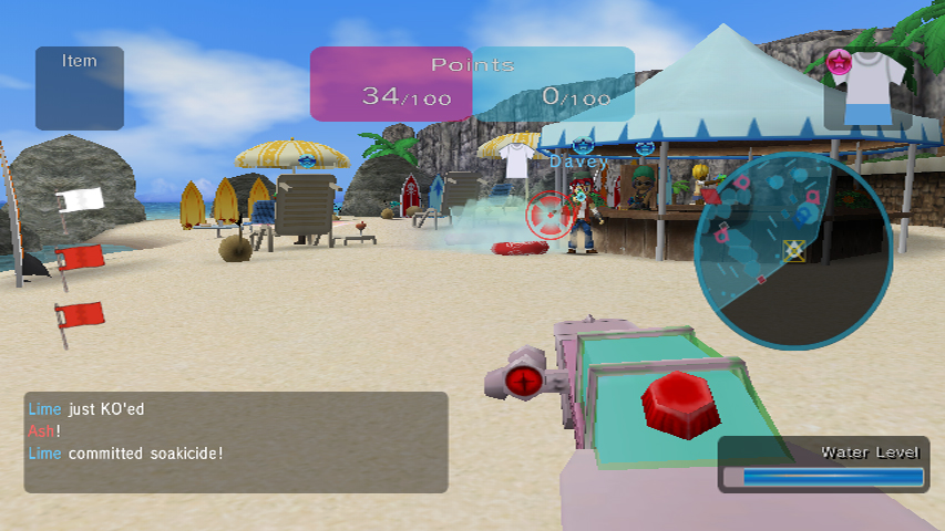 In Water Warfare, players go head to head or team up as they run around playgrounds and beaches to drench each other with squirt guns. They’ll be able to protect themselves with, what else, raincoats, towels and more. There are other items, like the umbrella, which can attack and defend at the same time! With different types of squirt guns, pick-up items, offline and eight player online multiplayer, there’s tons of squirt gun fun to be had. Throughout the game, players use the Nunchuk™ to control movement, aim using the Wii Remote™, and can load up on different squirt guns, such as shotguns and rocket launchers, to soak their opponents.