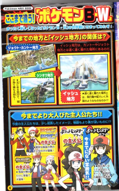 According to CoroCoro, Black/White will feature the Isshu Region and the characters will be older this time around. Additionally, while the magazine does not confirm it, it is rumored that the new Pokemon might be called Pokabu (Fire Pokemon) , Mijumaru (Water Pokemon), and Tsutaja (Grass Pokemon).