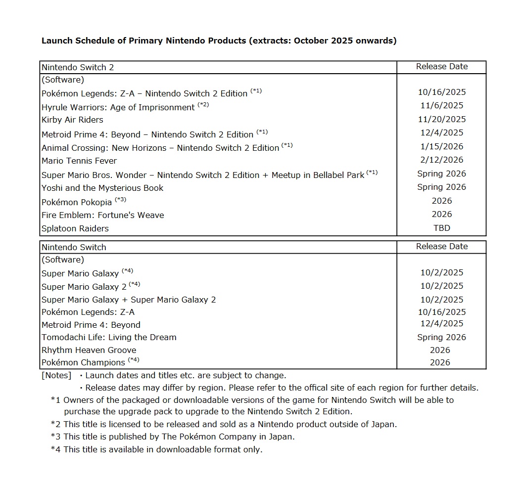 Nintendo has come through with the latest update on its release schedule, which is shared for November 2025 via its financial results documents.