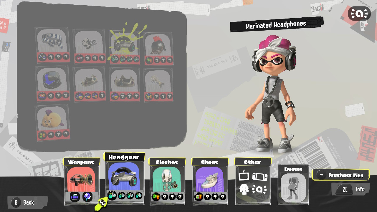 - Inkling Girl (Neon Yellow) unlocks three sort-of unrelated gear pieces: a fishbone scrap, a fancy schoolyard jacket, and the Knotty Bois.