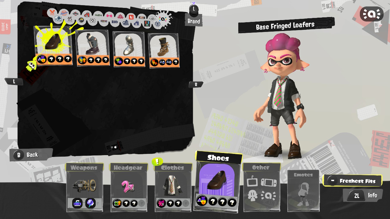 - Inkling Girl (Neon Pink) drops a whopping five different gear pieces! There’s a hair clip, two different school cardigans, and two different kinds of loafers.