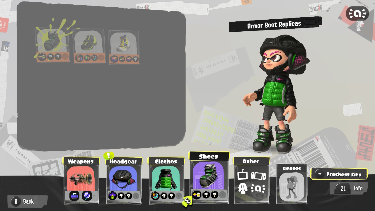 - Inkling Boy (Neon Green) drops four different items, and each one makes you look like a ninja! There are two different hoods, a suit, and a pair of boots.