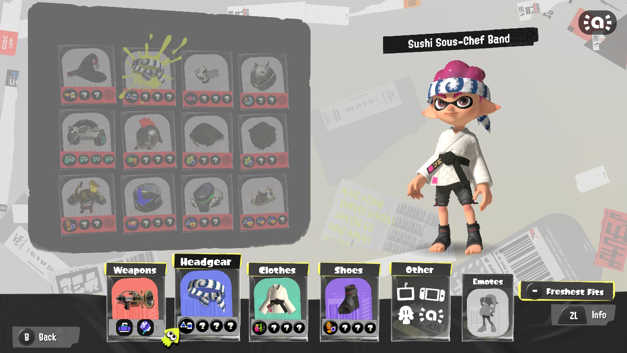 - Octoling Boy (Neon Blue) unlocks three rather unrelated pieces of gear. A chef’s headband, a black-belt Gi, and a pair of Kick Dampeners.