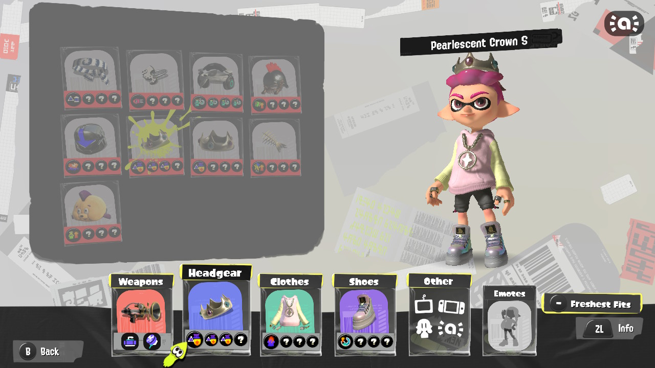 - Inkling Girl (Neon Pink) drops a whopping five different gear pieces! There’s a hair clip, two different school cardigans, and two different kinds of loafers.