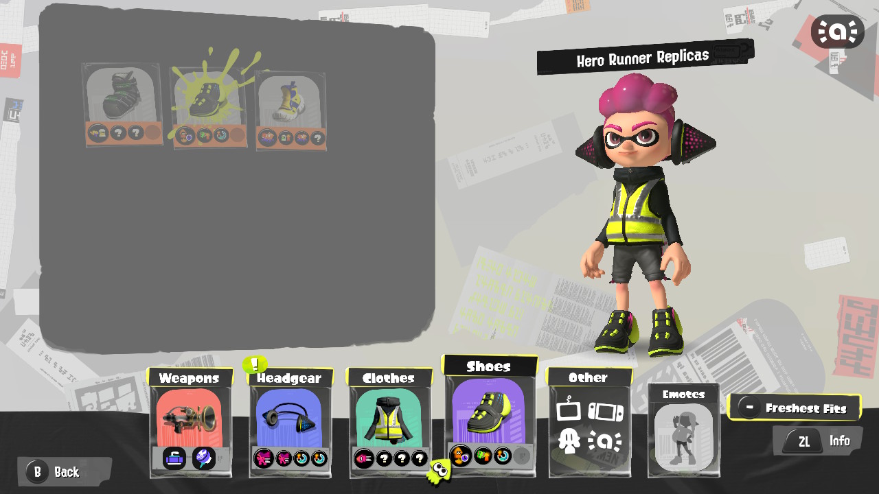 - Inkling Girl (Neon Yellow) unlocks three sort-of unrelated gear pieces: a fishbone scrap, a fancy schoolyard jacket, and the Knotty Bois.